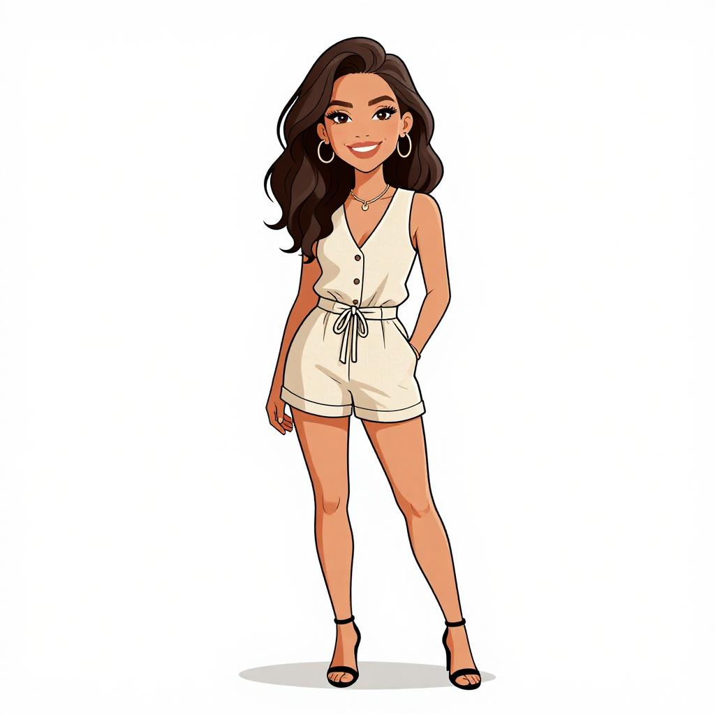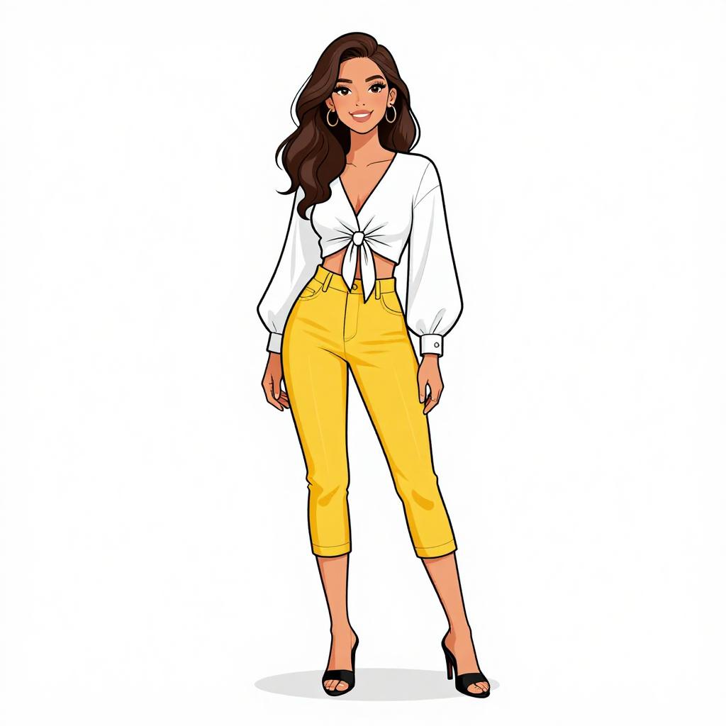 Woman with pretty face and pretty hair. smiling Woman, contemporary casual, cropped white tie-front top with long sleeves and buttoned cuffs, high-waisted yellow capri trousers with ruched hems, open-toe black mule shoes, plain white studio background. --sref 1467