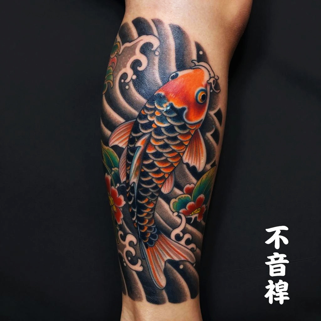 Vibrant tattoo of a colorful koi fish with flowing waves, red and orange scales, and green eyes on a dark background. Japanese characters on