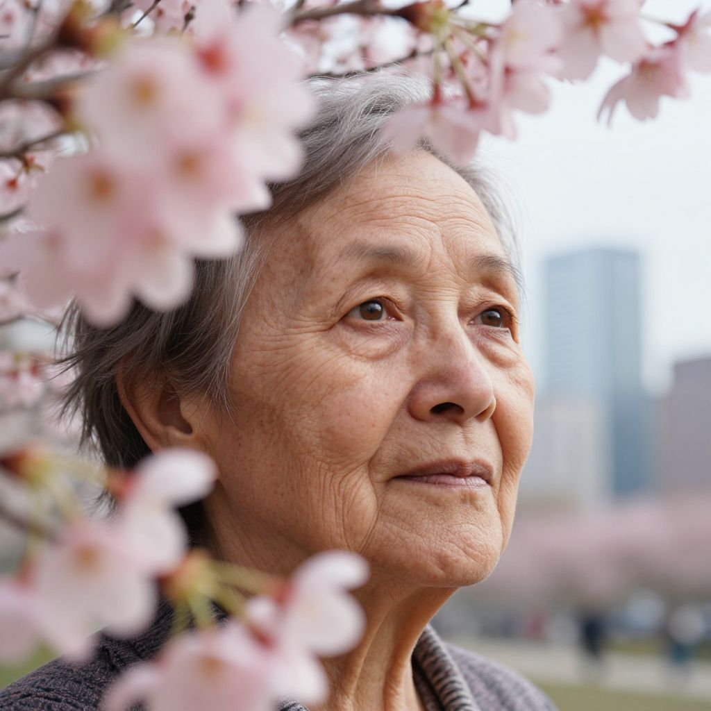 Photograph of an elderly Asian woman with wrinkled, fair skin and short, gray hair. She gazes upward with a serene expression, surrounded by soft-focus pink cherry blossoms in the foreground. She wears a dark, textured jacket. The background is blurred, featuring a bright, overexposed sky and indistinct cityscape. The cherry blossoms' delicate petals and subtle pink hues contrast with her weathered skin, creating a gentle, reflective mood. The image captures the essence of spring and the woman's contemplative demeanor.