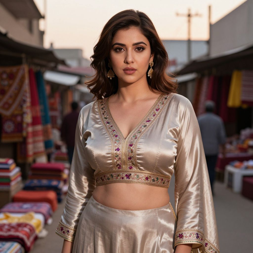 A beautiful woman with deep brown eyes and soft brown hair wearing a stylish satin salwar suit, the fabric glistening under soft studio lighting, standing in a traditional Indian marketplace at sunset with colorful fabrics and local vendors in the background. The woman has big breasts and cute face