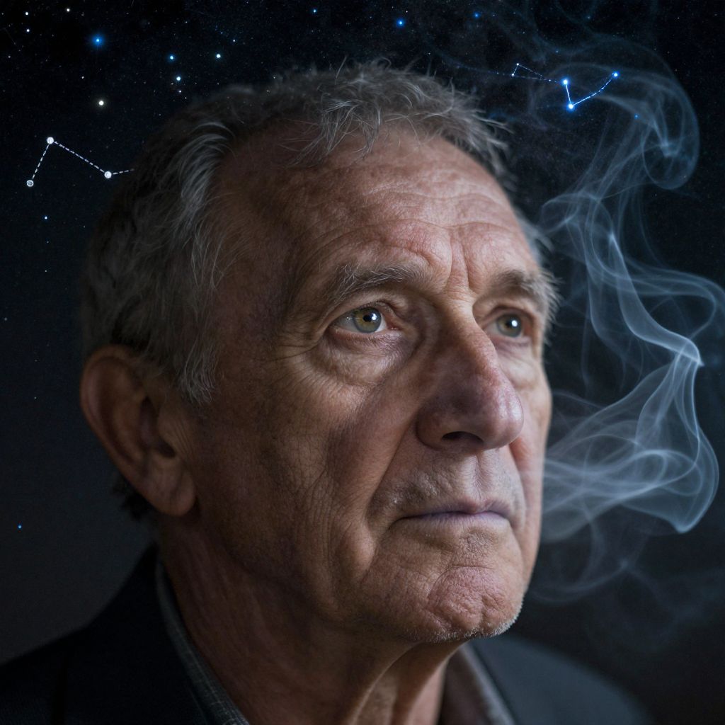 This is a digitally manipulated photograph of an elderly man with short, gray, slightly curly hair, and wrinkled skin. His blue eyes gaze thoughtfully into the distance. A wisp of blue-tinted smoke curls around his head, blending into a starry, cosmic background with constellations. The man's expression is serious and contemplative. He wears a dark, unremarkable jacket. The image combines realistic photographic details with a surreal, dreamlike quality, emphasizing a connection between the human and the cosmos. The lighting highlights the texture of his skin and the wisps of smoke.