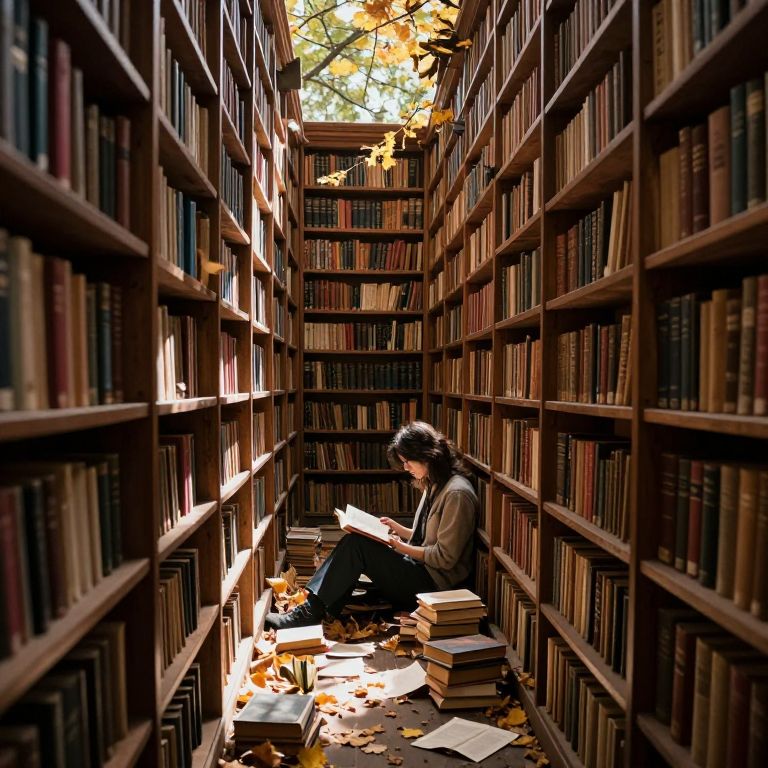 Mysterious library aisle bathed in dappled sunlight, flanked by towering wooden shelves filled with ancient tomes, where a solitary figure sits amidst scattered pages and autumn leaves, engrossed in reading while surrounded by the whispers of nature above.