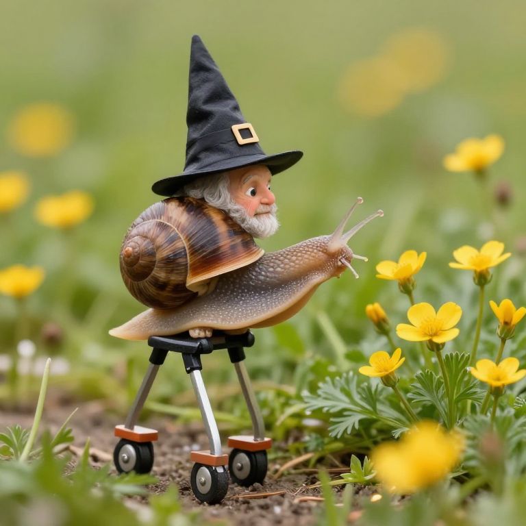 An elderly snail wears a tiny wizard’s hat and walks on stilts to reach the buttercups that grow too high for him.