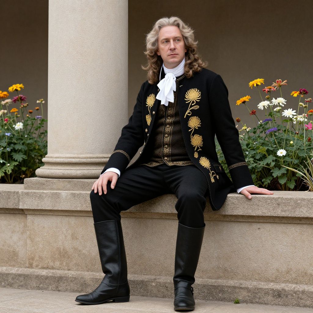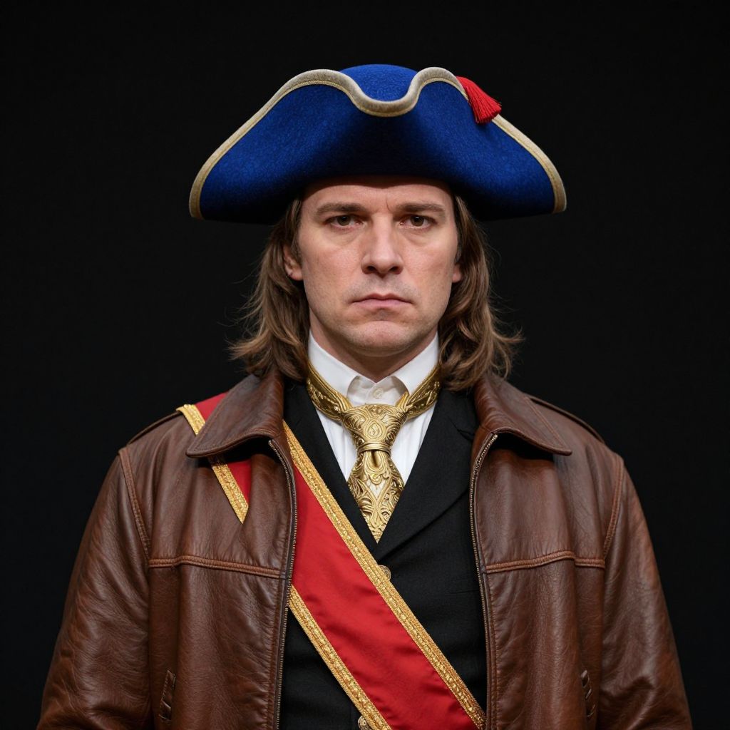 Photograph of a man with shoulder-length brown hair wearing a blue tricorn hat with a red tassel, a brown leather jacket, a black vest, and a white shirt with an ornate gold necktie. A red sash with gold trim is draped across his chest. He has a serious expression and is set against a solid black background.