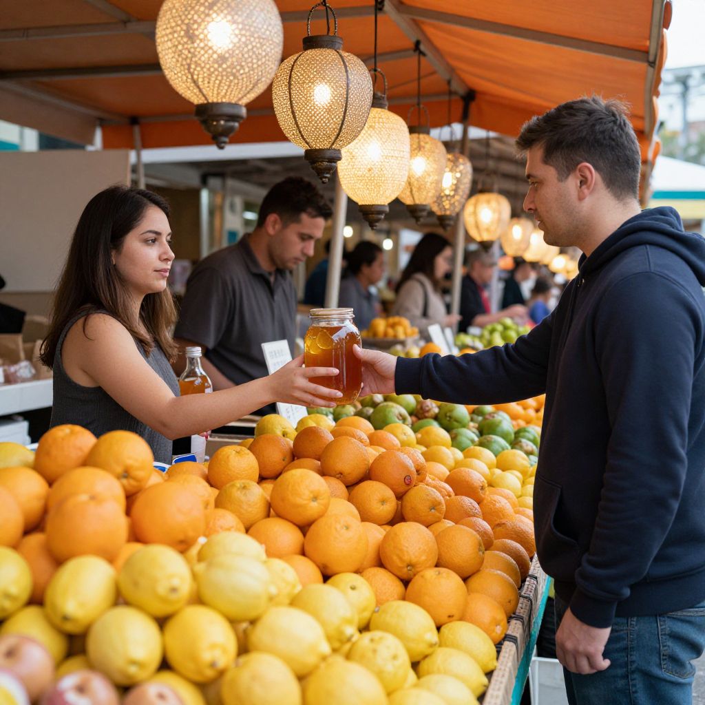 Marketplace scene unfolds with vibrant oranges and lemons piled high, as a man in a dark hoodie hands a glass jar filled with amber liquid to a woman in a sleeveless top, surrounded by hanging lanterns and bustling stalls under an orange canopy.