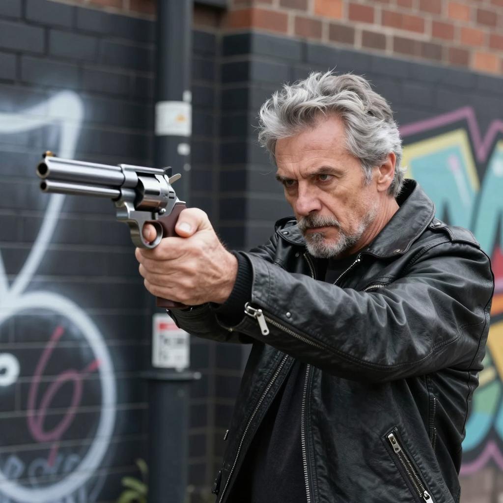 A middle-aged man with light skin, brown hair, and a mustache, aiming a revolver at the camera. He wears a dark leather jacket with a badge on the sleeve. His expression is focused. Background is blurred with warm tones. He holds the gun with both hands, extended forward.
