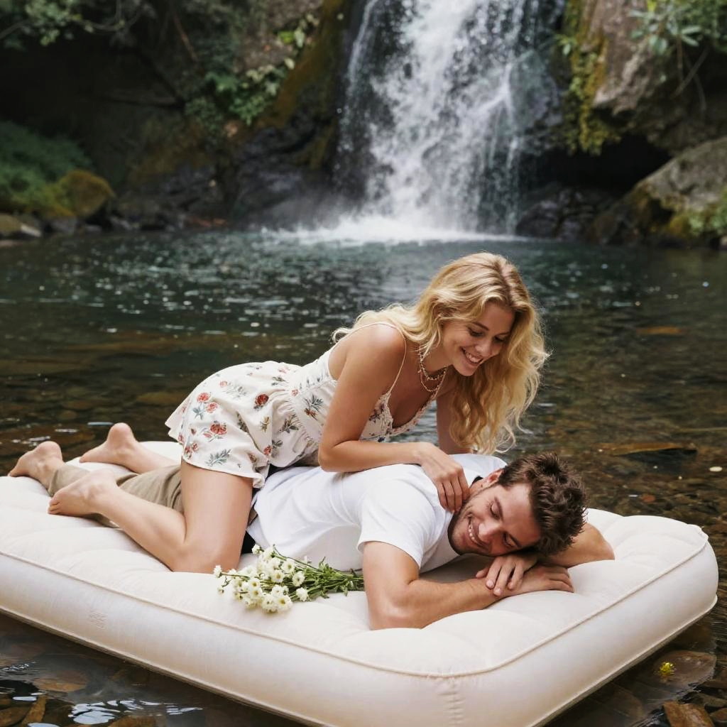 Photograph of a romantic outdoor scene: a blonde woman in a white floral dress straddles a man with short brown hair in a white t-shirt, lying on a large white air mattress by a calm river with a waterfall in the background. Both look happy and are surrounded by small white flowers on the mattress. The natural setting adds a peaceful vibe.