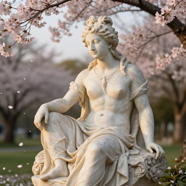 Ora, a serene ancient deity figure carved from marble, seated in a tranquil garden with cherry blossoms falling around, bathed in soft golden sunset light, rendered in classical sculpture style with photorealistic textures.
