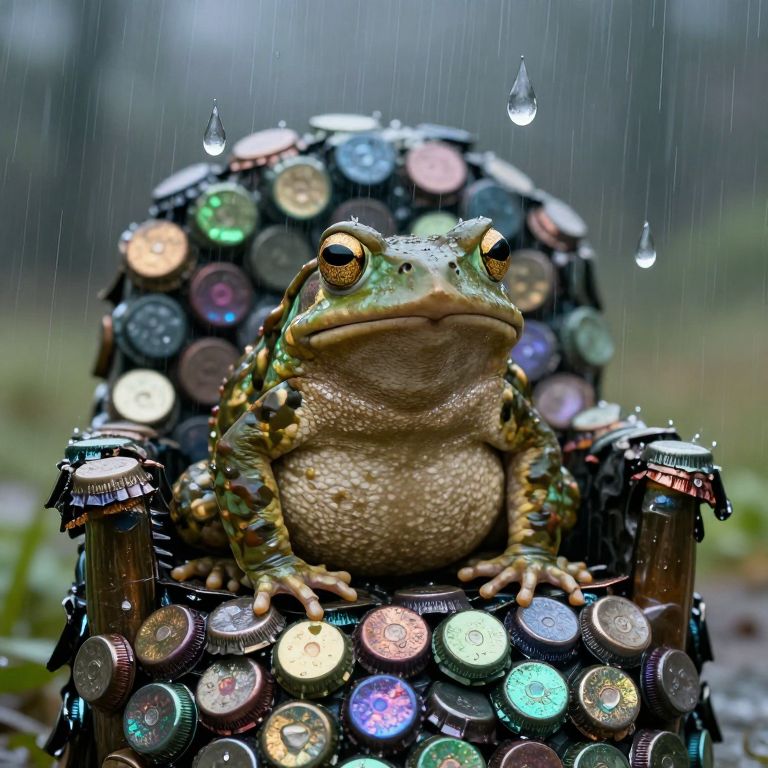 An ancient toad, perched atop a throne of shimmering bottle caps, rules over a kingdom of singing, sentient raindrops.