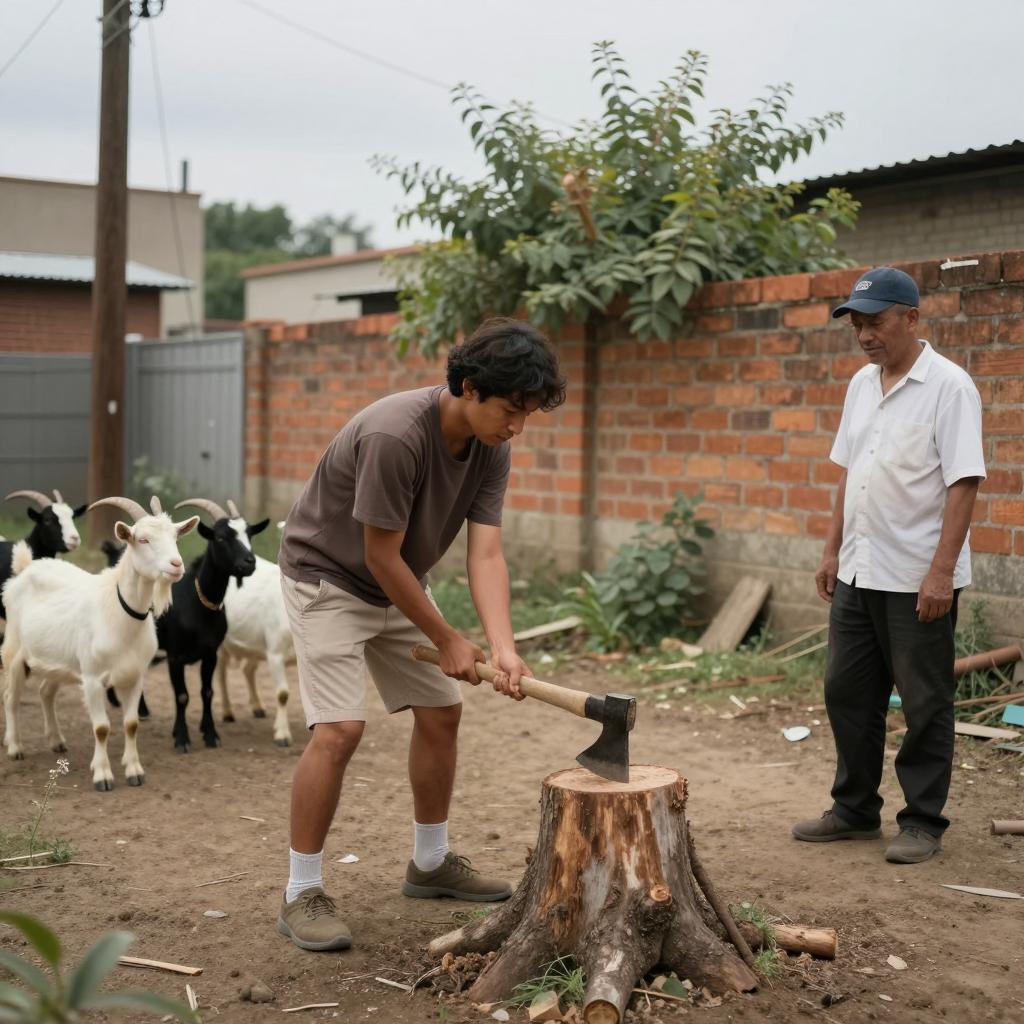 A young boy and an older woman in a sunlit, rural setting. Boy kneels, holding woman's hands. Both look at each other smiling. Boy has dark hair, wears a light shirt. Woman has long brown hair, wears a beige shirt with brown suspenders. Background includes a dirt road, small house, and distant hills.