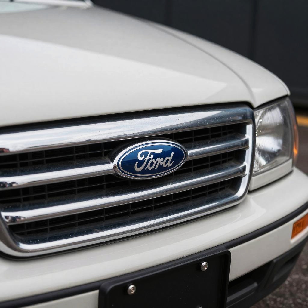 1990 Ford Fusion close-up, focusing on front grille and Ford emblem, ultra-detailed, sharp shadows and highlights, studio lighting setup