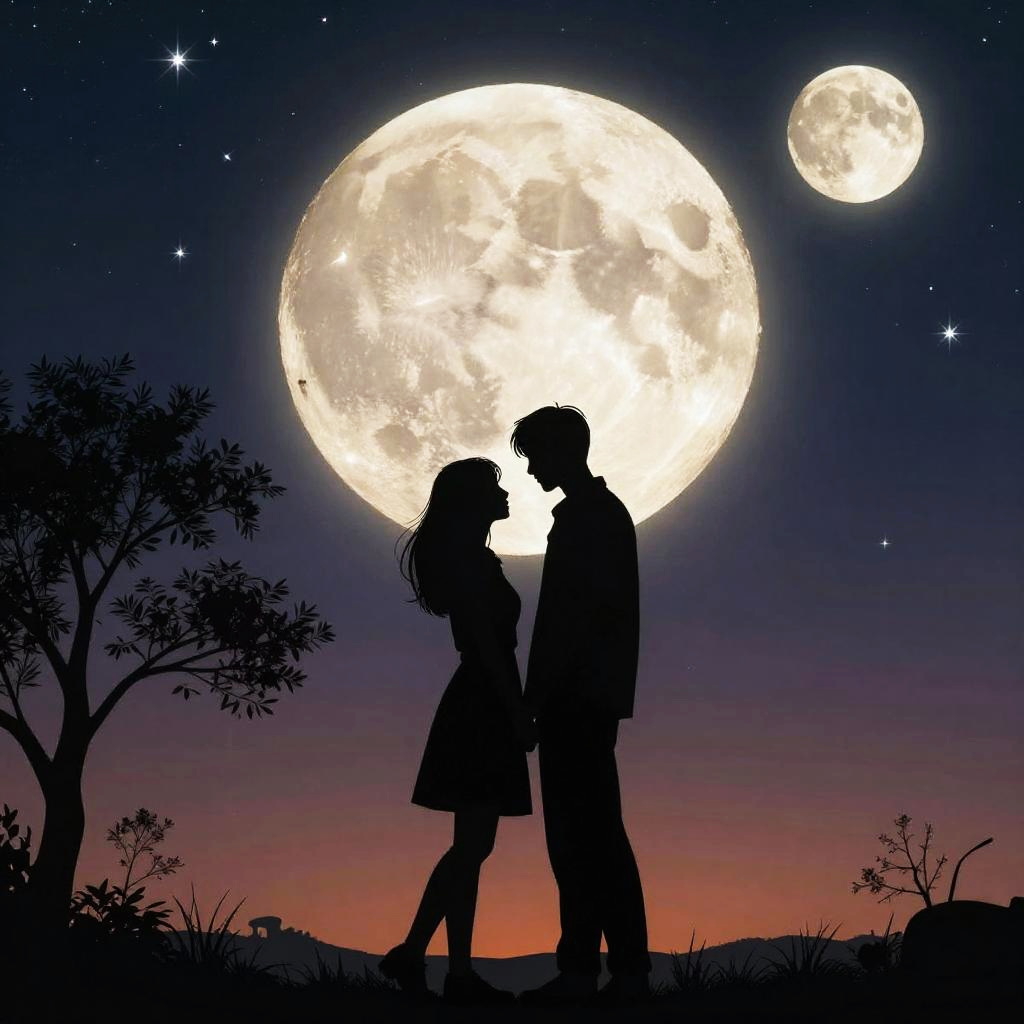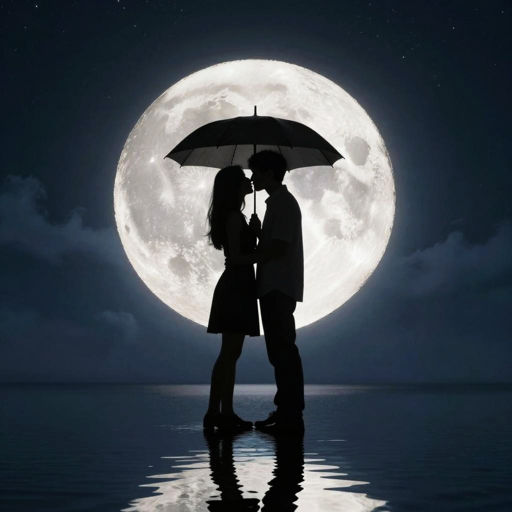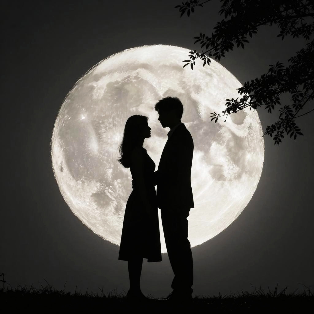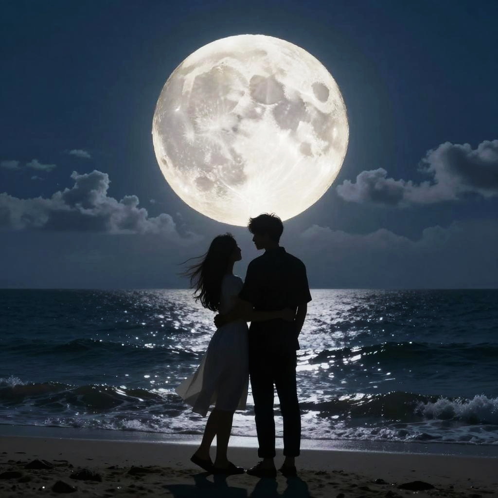 A photograph of a silhouetted couple standing closely together in a dark cave entrance, with a bright, full moon glowing intensely in the blue-tinted night sky behind them. The sea is visible in the background, reflecting the moonlight. The rocky cave frames the couple, creating a romantic, mysterious atmosphere. The image has a strong contrast between the dark cave and the luminous moon.