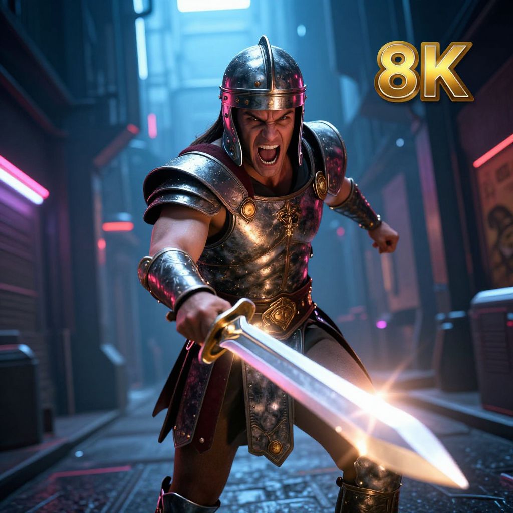 Digital art of a fierce, armored warrior with glowing sword, shouting in a neon-lit alley at night, "8K" logo in top right
