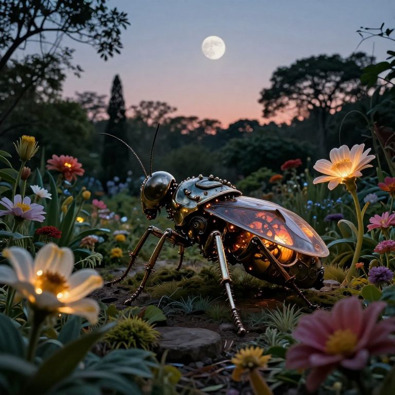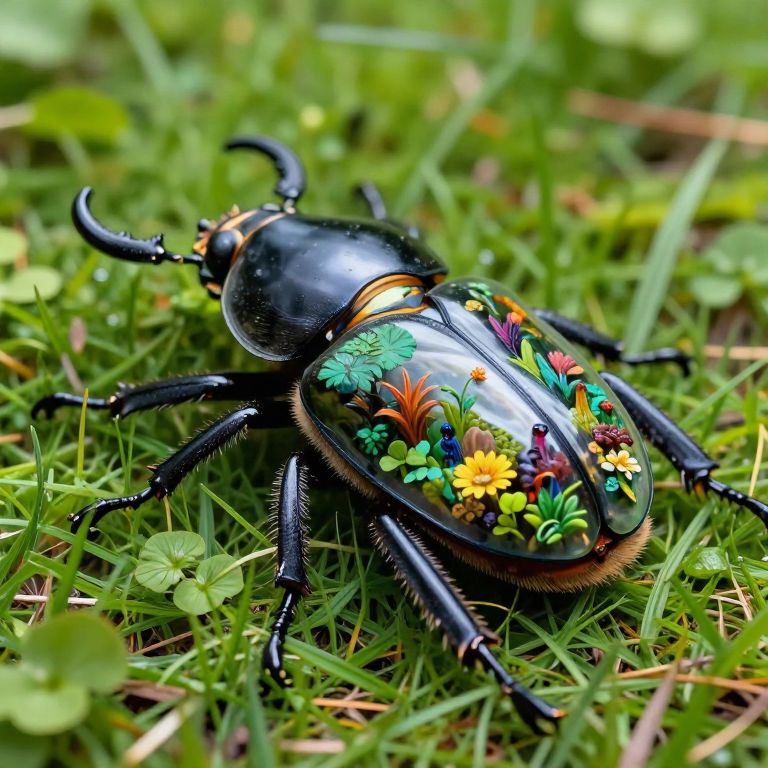 Colossal beetle with a glossy black exoskeleton and translucent shell reveals a vibrant miniature ecosystem within its body, featuring lush green grass, diverse flora, and a small humanoid figure standing amidst the scene, symbolizing the intricate balance between nature and forgotten evolution.