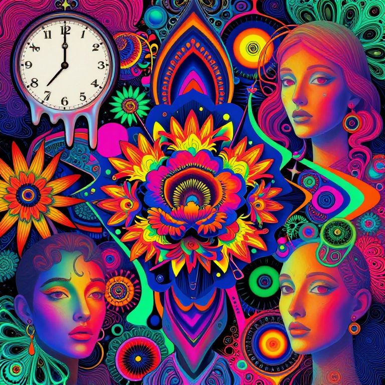 Intricate psychedelic collage with melting clocks, surreal faces, bright neon flora, and abstract geometric forms intertwined, incorporating vivid gradients, fractal patterns, and hallucinogenic visual motifs, rich in texture and saturated colors.