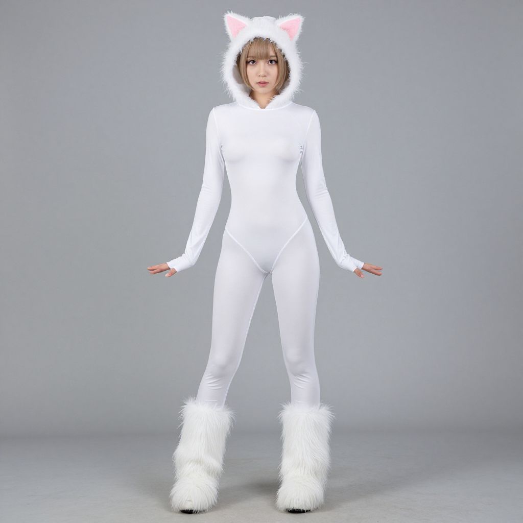"White Gogo Boots Costume, in a white cat suit with furs and boots"
