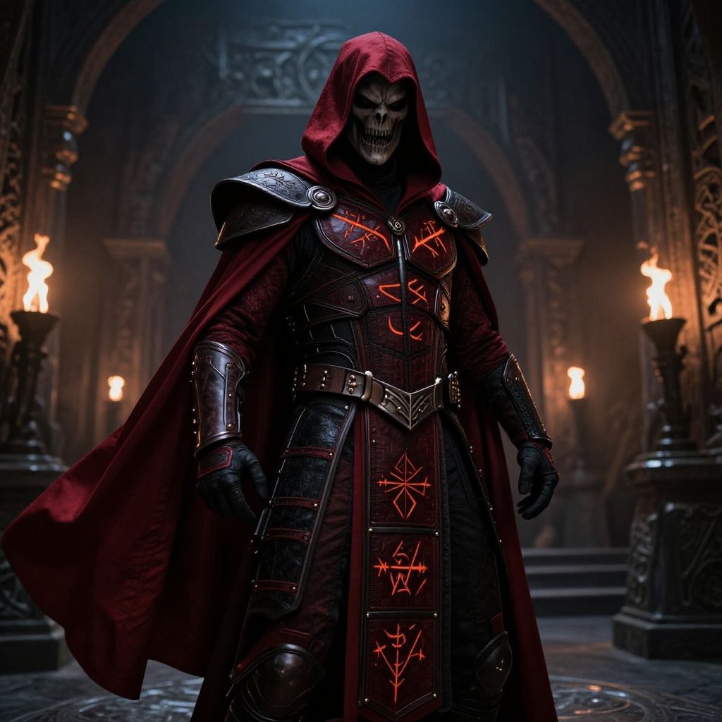 Dark, ominous figure in red hooded cloak and black armor with glowing red runes, stands in dimly lit, gothic cathedral with torches.