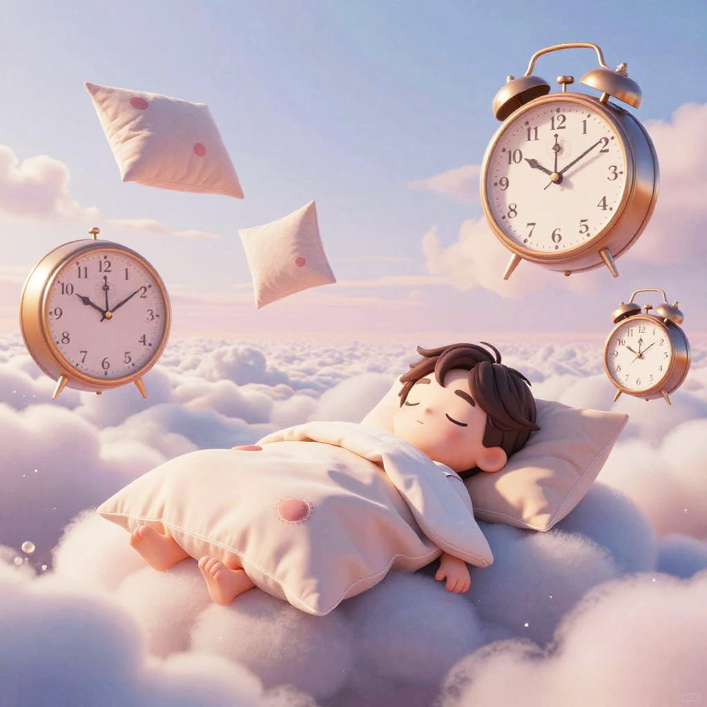 Bigsleep scene depicting a surreal dreamscape with giant floating clocks and massive, soft pillows drifting through pastel clouds, ethereal lighting, and whimsical, serene atmosphere, digital art with high detail and fantasy vibes.