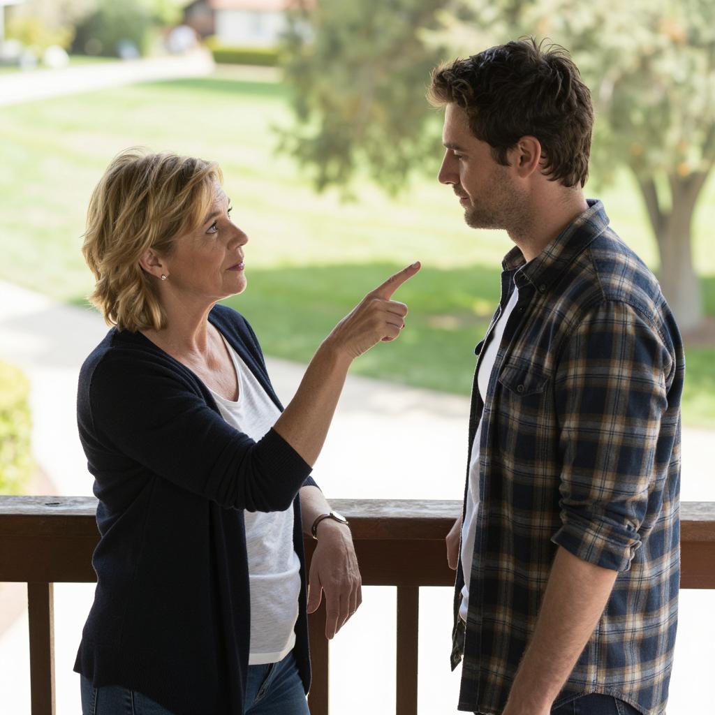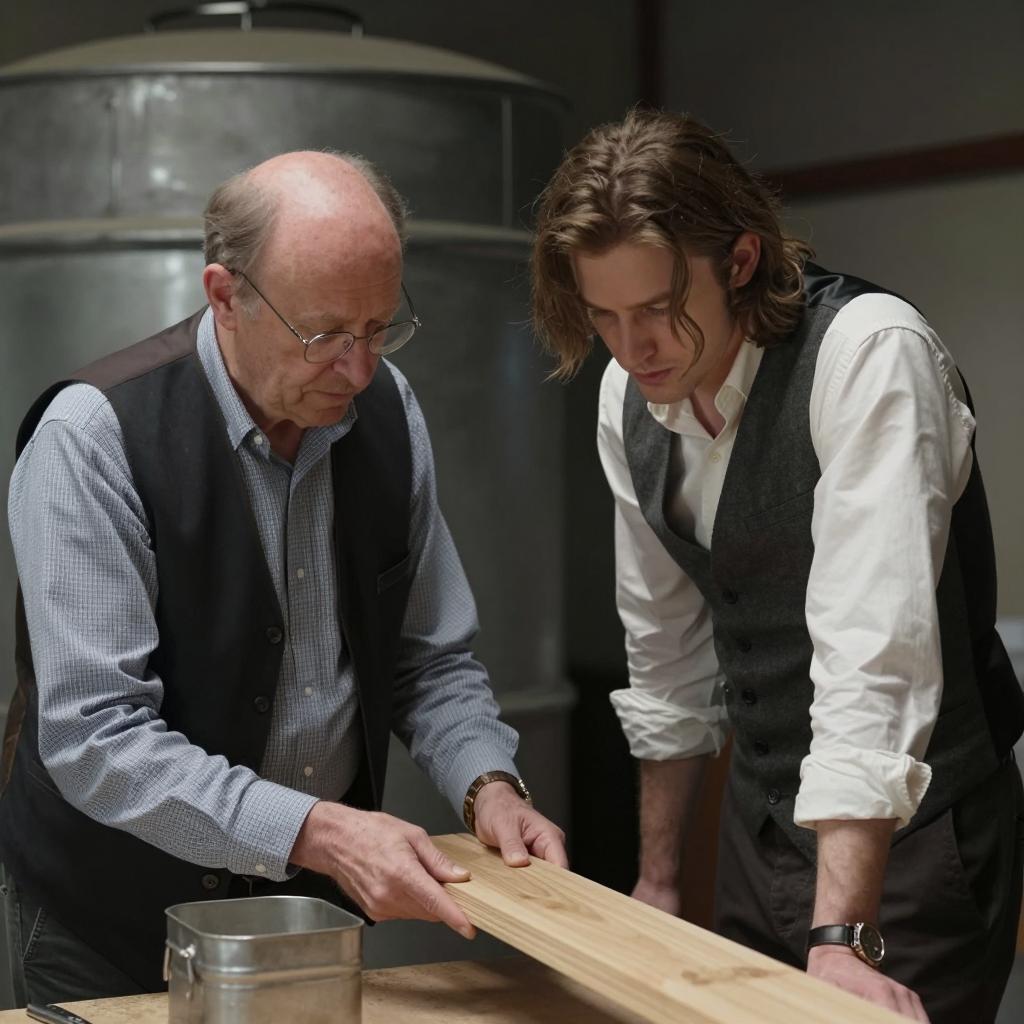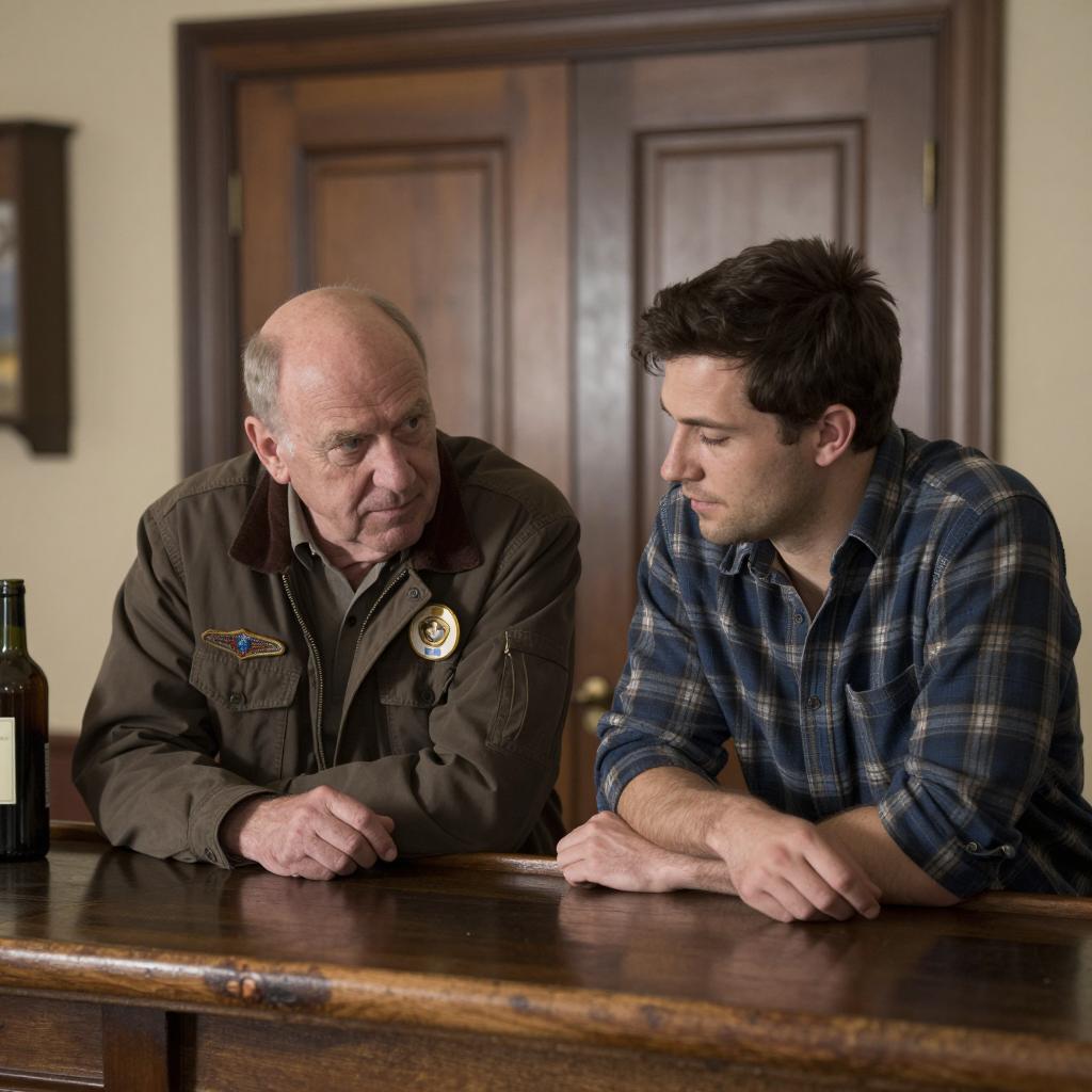 An older man with a balding head wearing a brown jacket adorned with badges and a younger man with short dark hair dressed in a blue plaid shirt leaning on a dark wooden bar counter. They are engaged in a serious moment with wooden-paneled doors in the background and a dark bottle partially visible on the left side of the bar.