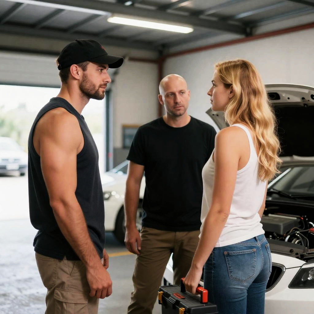 Photograph of a garage with three people. A muscular man in a black cap and sleeveless shirt stands left, facing a blonde woman in a white tank top and jeans. A bald man in a black shirt is between them. A white car with its hood open is in the background. The woman holds a toolbox, interacting with the others. The garage has a metal roof and industrial lighting.