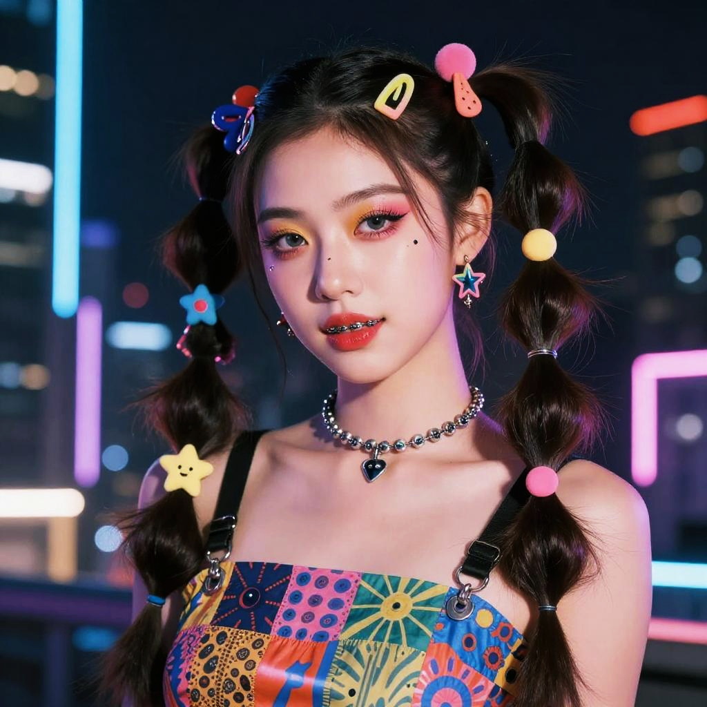 Artistic fashion portrait featuring braces pigtails, creative hair accessories, bold makeup, neon city lights at night, futuristic vibes with vibrant color contrasts, high resolution
