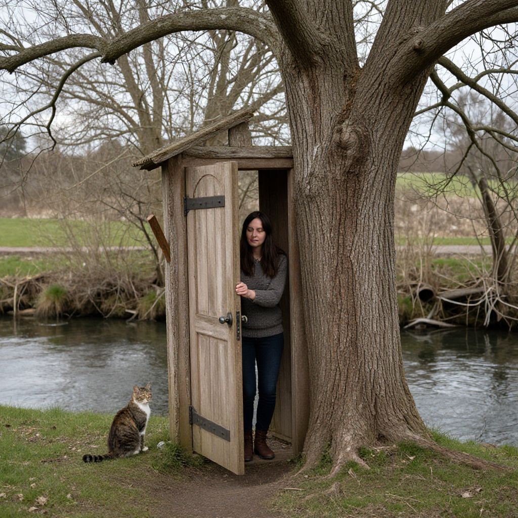 Woman stands within a rustic wooden doorway carved into a towering, gnarled tree, gently pushing open the door as a solitary cat sits alert on the grassy bank beside a tranquil stream winding through a serene, leafless landscape.