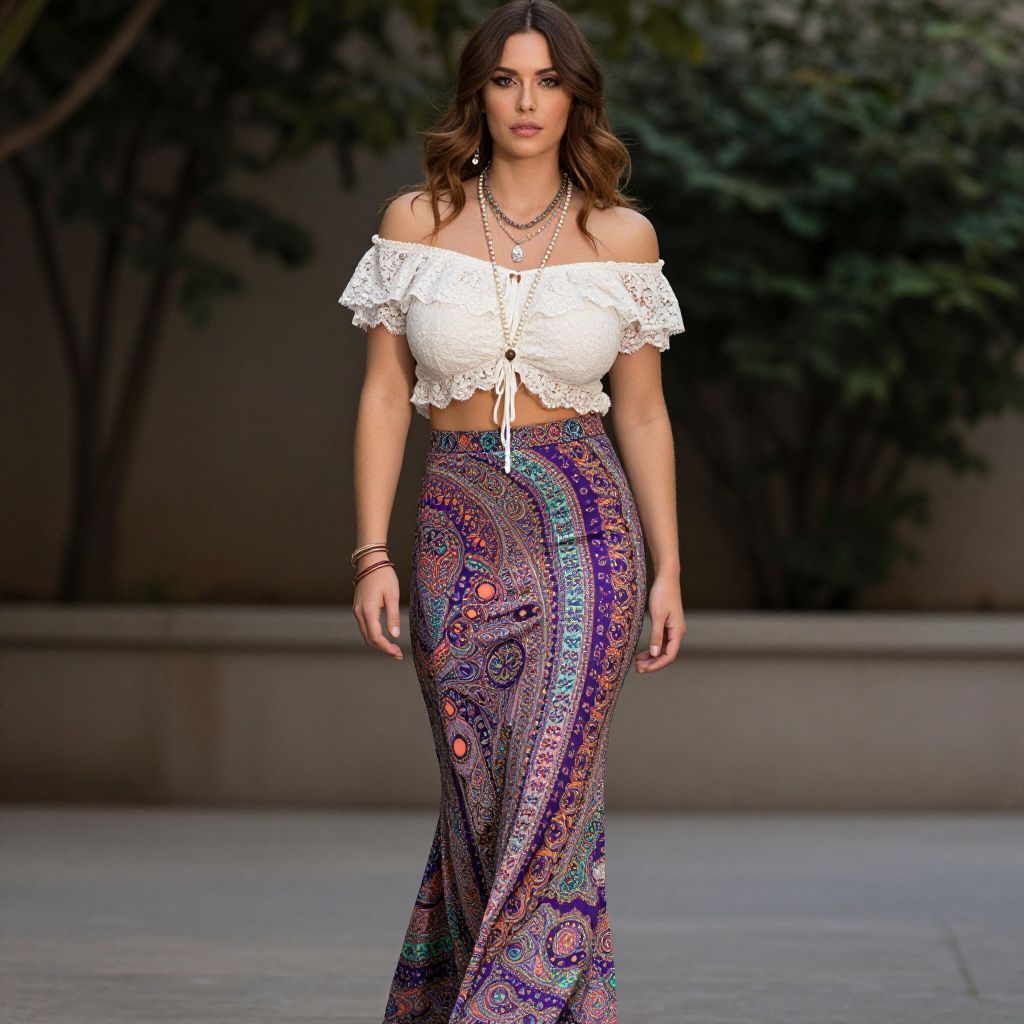 "Woman, bohemian, off-shoulder cropped lace top in ivory with ruffle detailing, long fitted paisley patterned skirt in a mix of purples, pinks, greens, and blues, ankle-length with a slight flare, layered necklaces, thin bangle bracelets.. Sexy. Pretty face and beаutiful eyes. Big breasts."