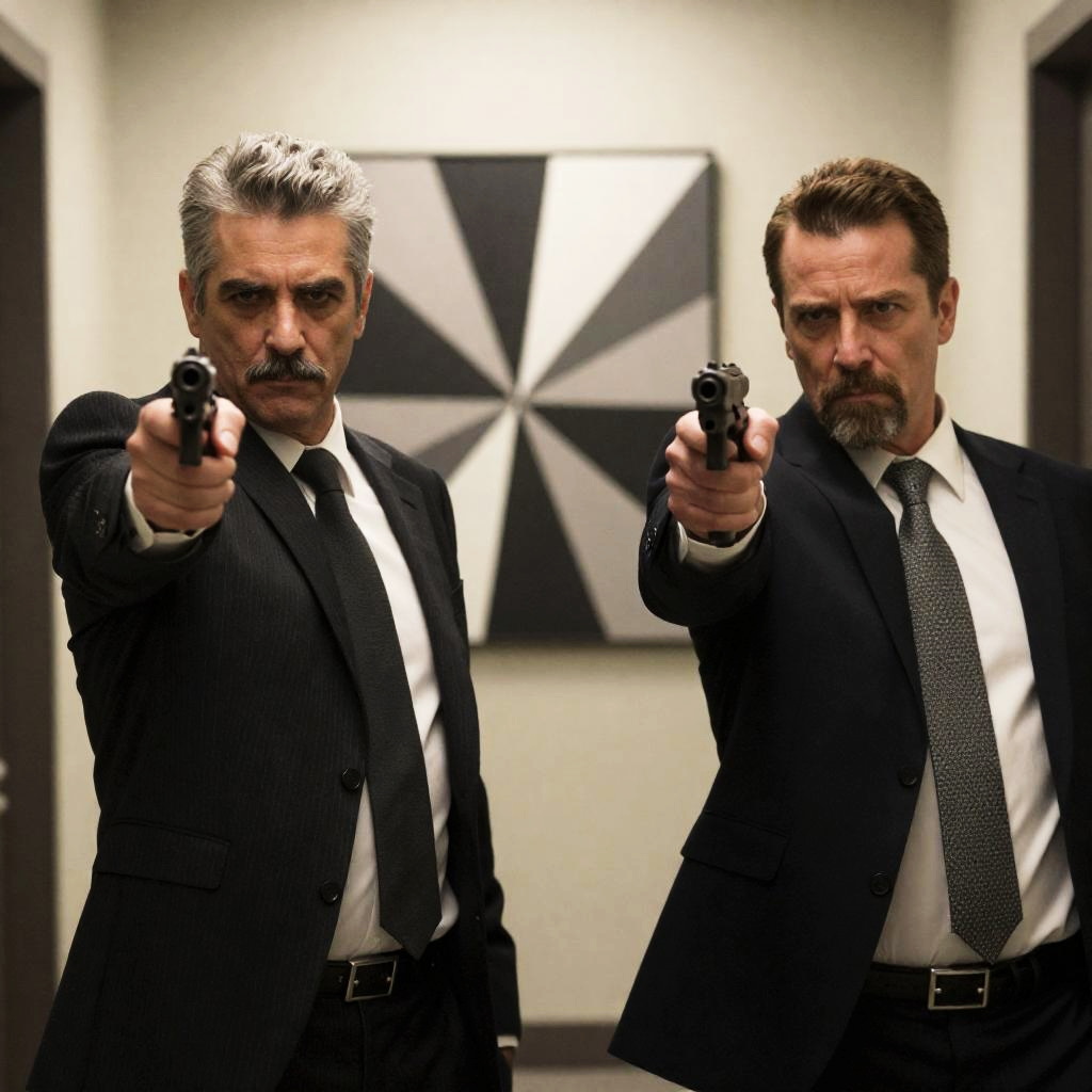 Photograph of two men in a hallway. Both point guns forward. Left man, gray hair, mustache, black pinstripe suit. Right man, brown hair, beard, black suit, white patterned tie. Intense expressions. Geometric wall art in background.