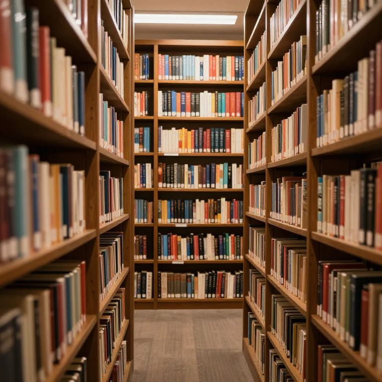 Photograph of a narrow library aisle with tall, wooden bookshelves on both sides filled with a variety of books. The shelves are uniformly spaced, and the books are neatly arranged, displaying a colorful mix of covers. The aisle's wooden floor is textured and matches the shelves. At the end of the aisle, another set of shelves is visible, creating a symmetrical perspective. The lighting is warm, highlighting the rich wood tones and colorful book spines. The background shelf has a mix of red, blue, yellow, and white books.