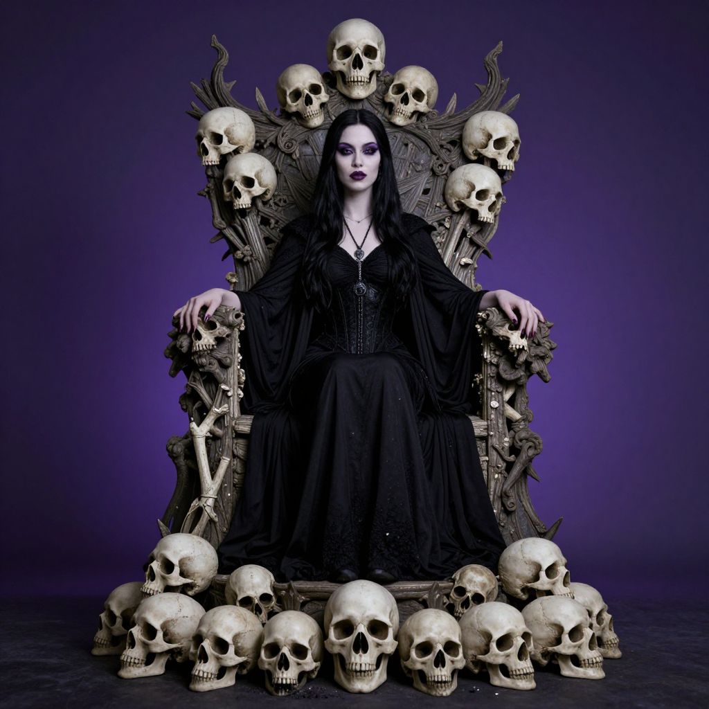 Photograph of a pale, dark-haired woman with heavy makeup, wearing a black, gothic-style dress, seated on a throne adorned with numerous skulls. Her hands rest on skull-encrusted armrests, and the throne is surrounded by additional skulls on the floor. The background is a deep purple gradient, enhancing the ominous, macabre atmosphere. The woman's expression is stern and commanding, adding to the dark, eerie vibe of the image. The throne has intricate, gothic carvings, and the overall composition is stark and dramatic.