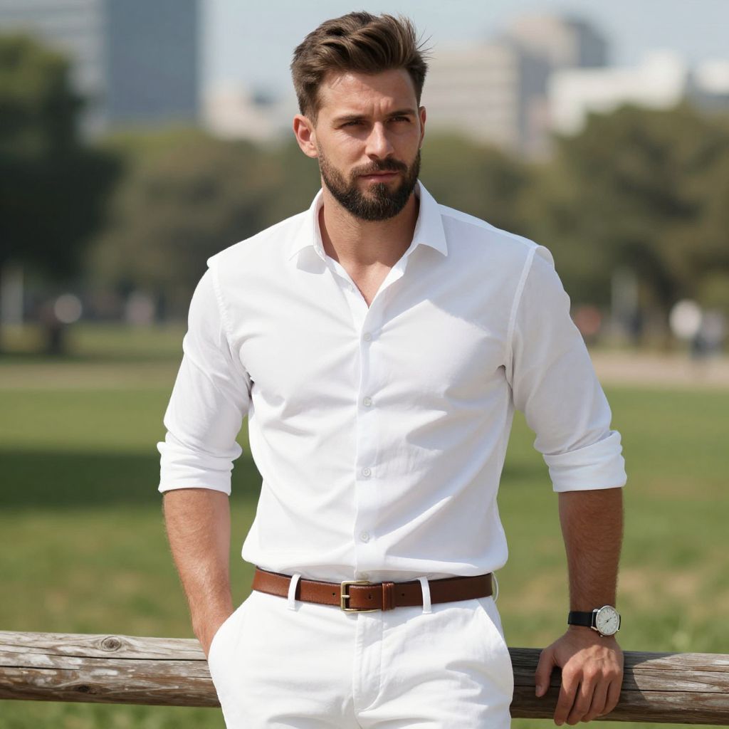 Photograph of a handsome, bearded man with short brown hair standing outdoors on a sunny day. He's wearing a crisp white button-up shirt with rolled-up sleeves and white pants, both complemented by a brown belt. He leans against a wooden fence, with a blurred green park and cityscape in the background. He looks confident, with a slight smile, and has a wristwatch on his left wrist.