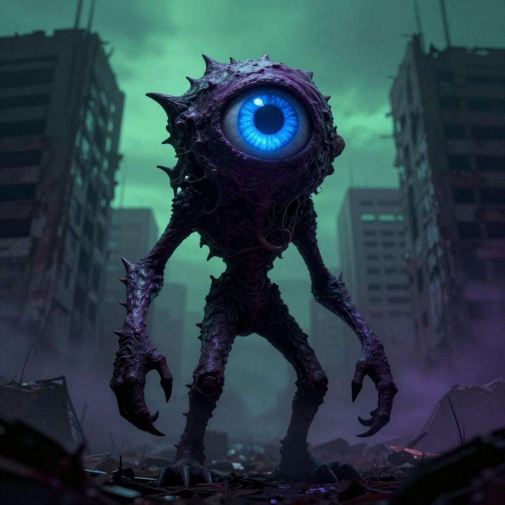 A surreal depiction of a mutant creature with a single glowing blue eye standing in a dystopian urban environment with tall, decaying buildings. The creature features dark, textured, organic shapes with spiky limbs, set against a moody background of green and purple hues.