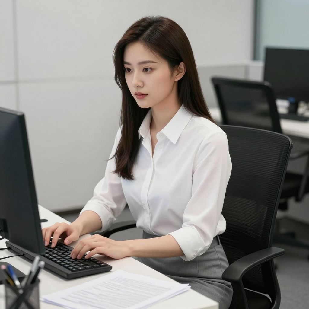 Photograph of an Asian woman with straight, dark brown hair sitting in an office chair, working on a black laptop. She has a fair complexion and is wearing a white, long-sleeved blouse with a gray skirt. Her expression is focused and slightly serious. The background is a modern office with white walls and black office chairs. Another black monitor is visible in the blurred background. The image is brightly lit, emphasizing the professional setting and the woman's neat, business-casual attire.