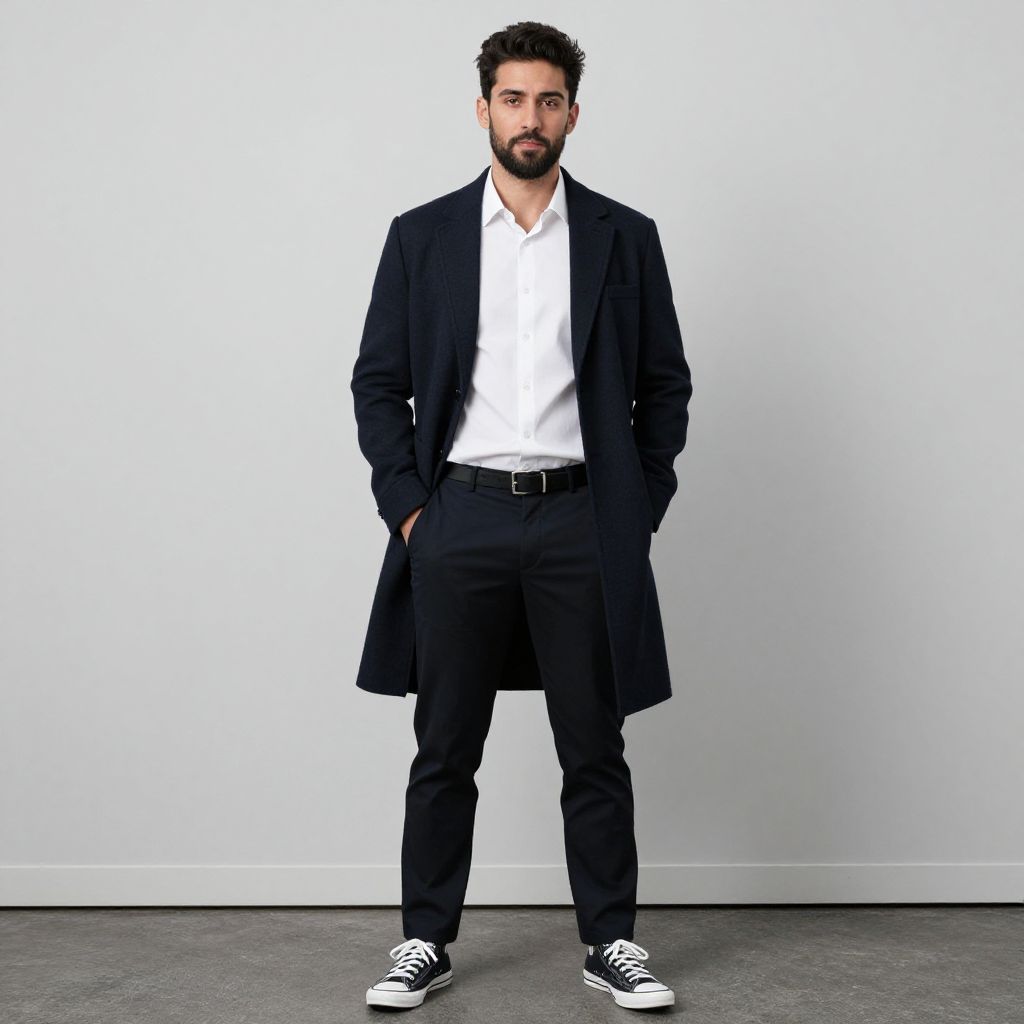 "original man costume, 1boy, male focus, solo, facial hair, hands in pockets, full body, beard, coat, shoes, standing, pants, sneakers, shirt, white shirt, belt, black hair, looking at viewer Realistic photo of casual sexy person with pretty face"