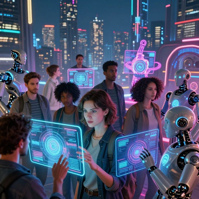 Humanos depicted in a futuristic cityscape, blending advanced technology with organic elements, people interacting with holograms and robots, vibrant neon lights illuminating their diverse faces, ultra-realistic style, intricate details, dynamic composition.