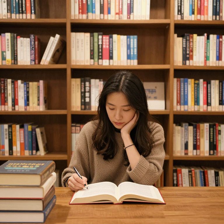 Photograph of an Asian woman with long black hair, wearing a beige knit sweater, sitting at a wooden table in a library. She rests her head on her right hand, focused on writing in a notebook with a pen in her left hand. An open book lies in front of her. In the foreground, there are two stacked books with colorful spines. The background features a wooden bookshelf filled with various books of different colors and sizes. The lighting is warm, highlighting the cozy and studious atmosphere. The woman's expression is concentrated and serene.
