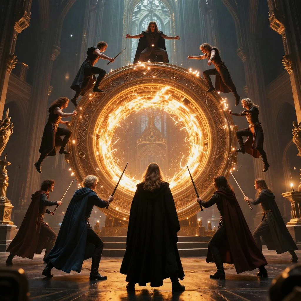 A hyperdetailed cinematic scene showing a group of mages in action poses surrounding a large, glowing magical portal inside a grand cathedral-like hall. The mages wear dark cloaks and wield staffs or wands, conjuring a bright, swirling ring of fire and light. The background features intricate gothic architecture with tall arched windows and ornate pillars, emphasizing a high fantasy atmosphere.