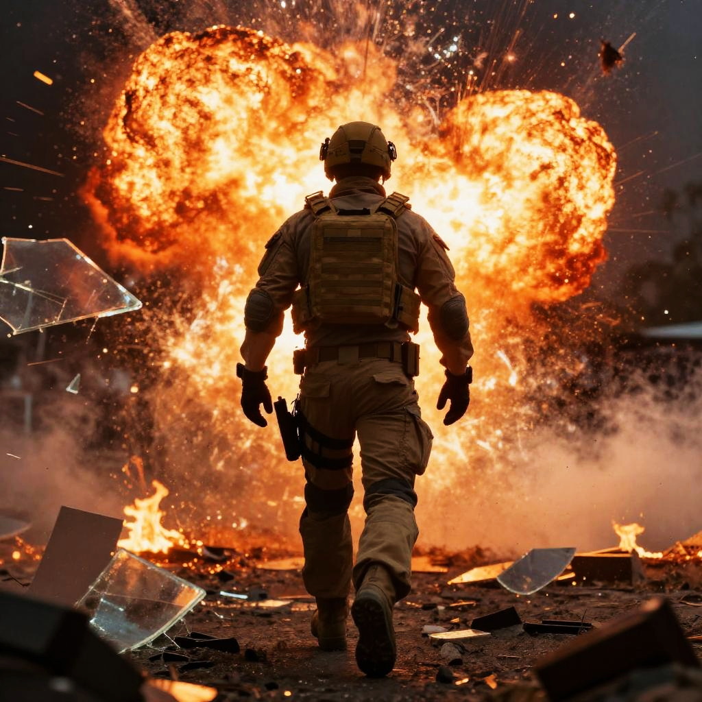 Explosion walk away image, hero in tactical gear walking away from an intense orange and red explosion, shattered glass and fire embers scattered around, dramatic backlighting, action thriller style
