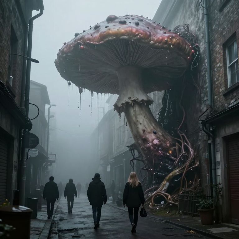In a fog-laden alley where reality bends and shadows whisper secrets, a colossal, otherworldly fungus looms above, dripping tendrils of mystery onto a street where figures navigate the liminal space between the mundane and the surreal, their steps echoing with the weight of unseen burdens and unspoken fears.