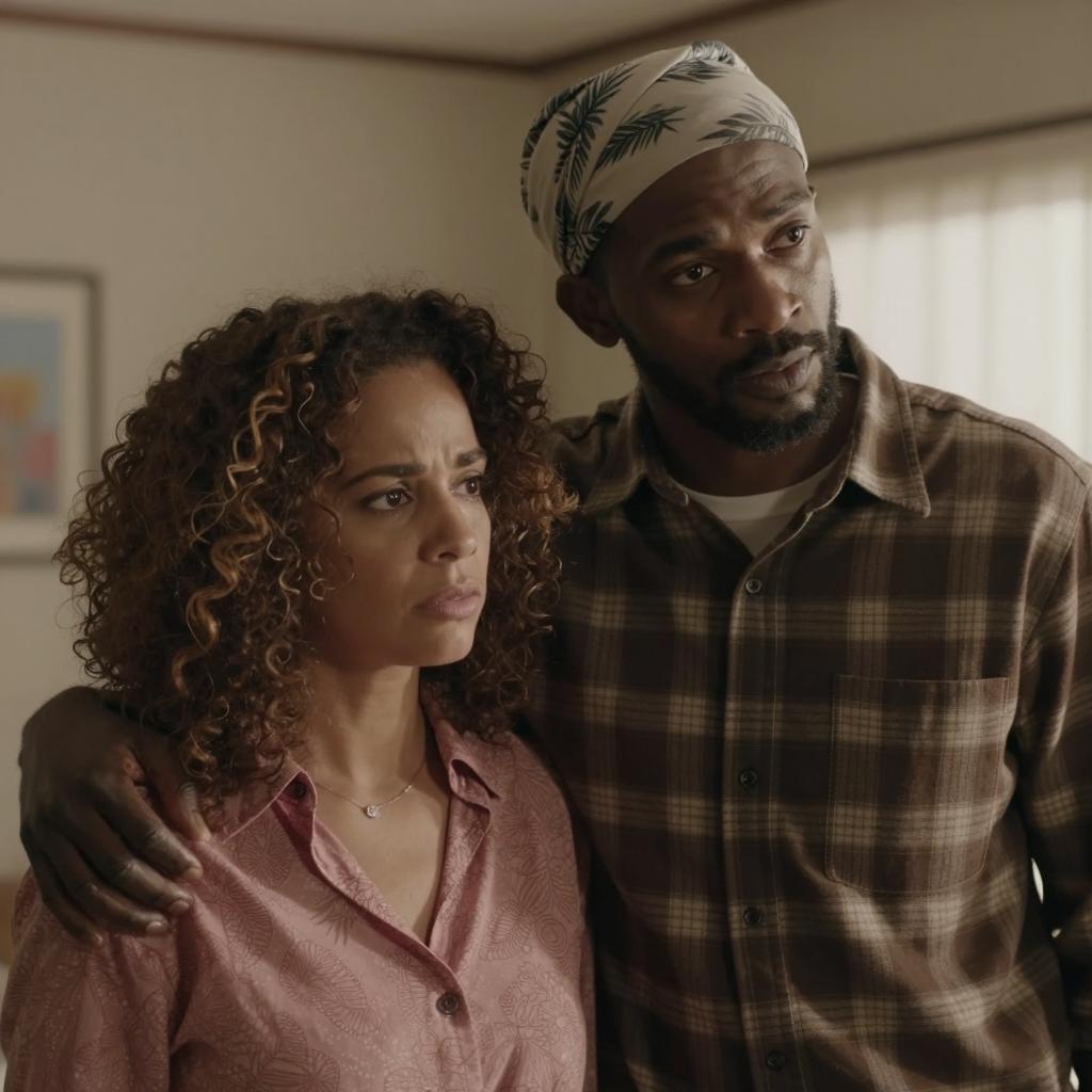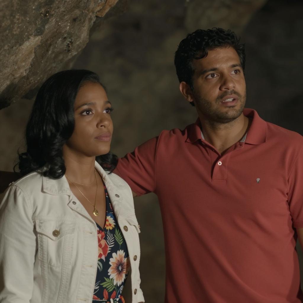Two people in a dimly lit cave. A woman with medium brown skin, black hair, and a white jacket over a floral dress looks to the left. A man with light brown skin, dark hair, and a red polo shirt looks ahead with an open mouth. Both have visible necklaces. The man's right arm is extended.