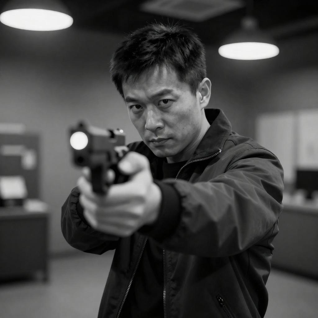 Black-and-white photograph of a man with messy dark hair, wearing a white shirt with rolled-up sleeves, aiming a handgun with his right hand. He stands in a dimly lit room with a wooden door on the right. His expression is focused and determined. The image has a gritty, high-contrast style.