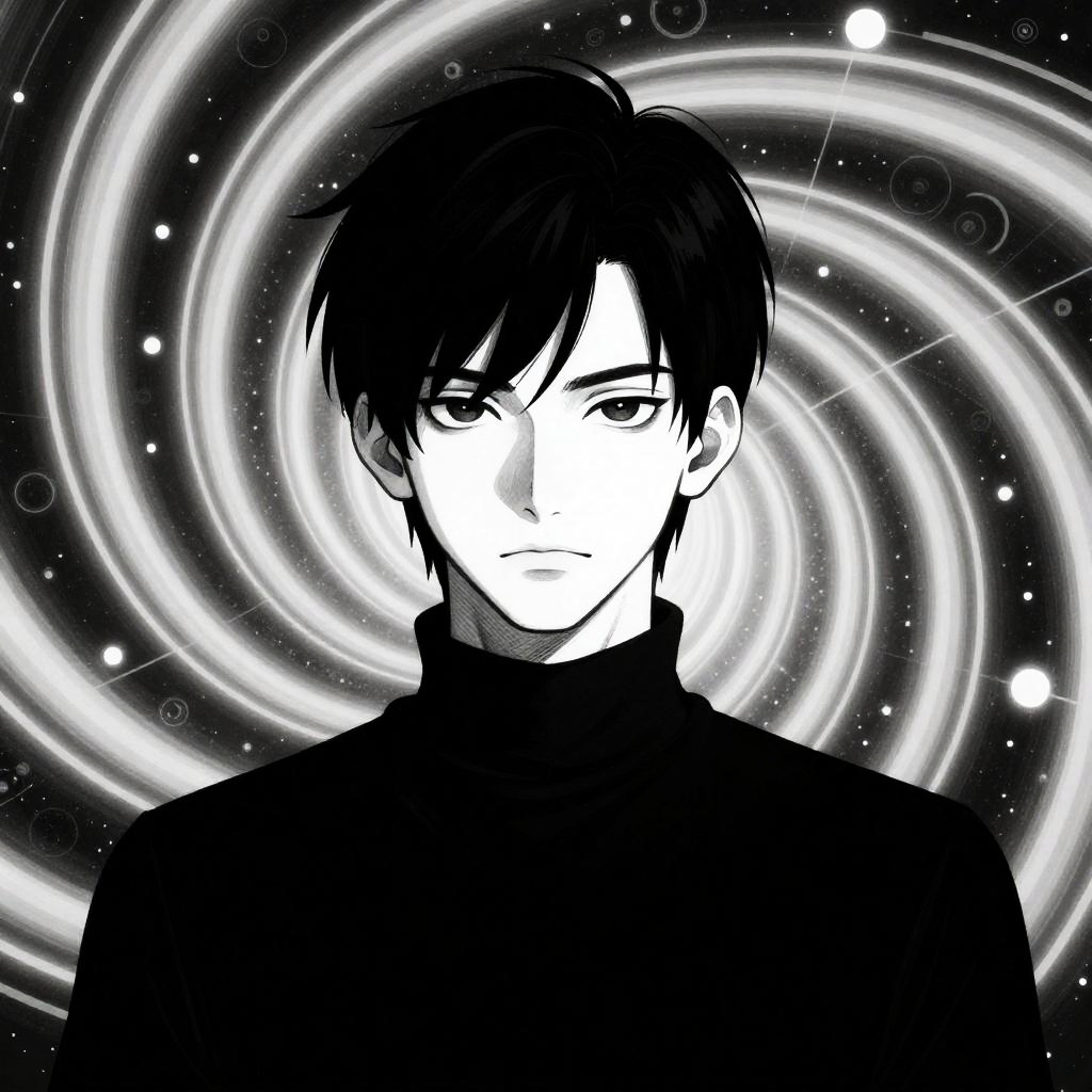 Monochrome digital artwork featuring a serious young man with short, dark hair wearing a black high-neck shirt. The subject's pale face contrasts sharply with the dark cosmic spiral background filled with circular and dotted patterns. The style combines modern and pop-art influences, creating a psychedelic, hypnotic visual effect.