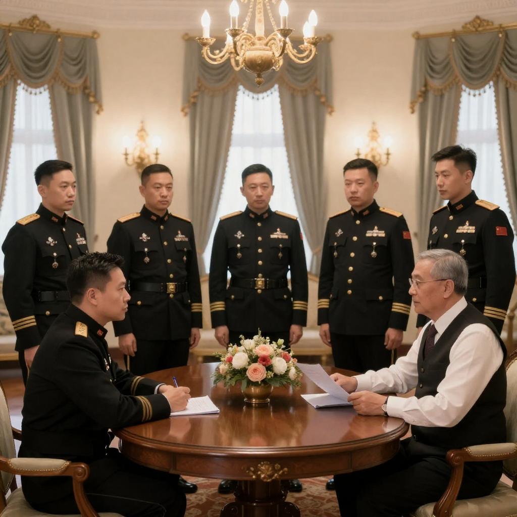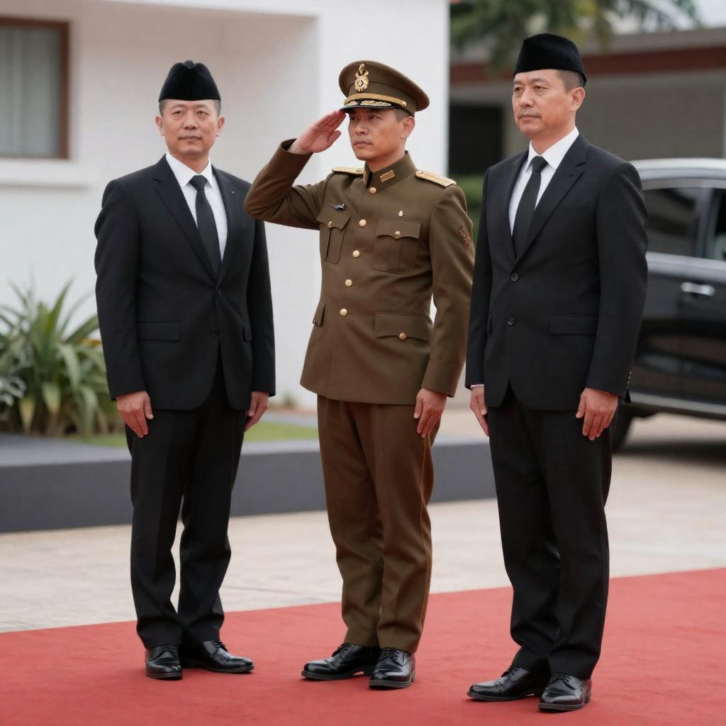 Photograph of three men in formal black suits and hats standing on a red carpet. One man in a brown military-style uniform with a cap and peaked hat salutes. Background includes a white building, greenery, and a parked vehicle.