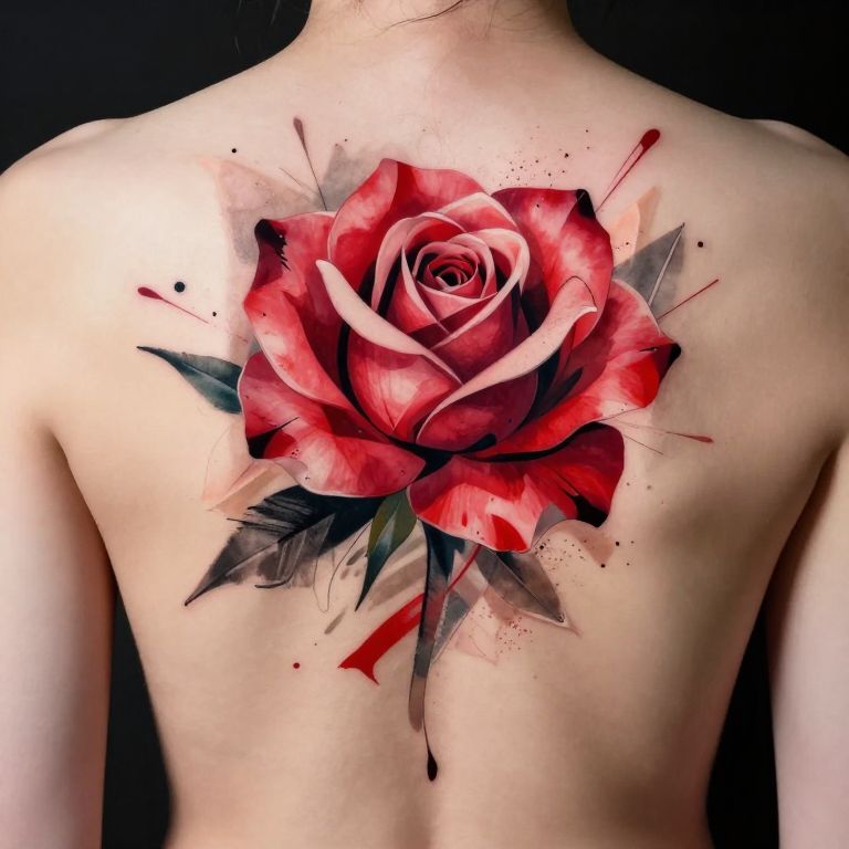 Abstract rose tattoo, geometric and fragmented petals, combining sharp angles and soft curves, vibrant reds mixed with abstract splash effects, large scale piece on the back, blending modern tattoo art with surreal elements.