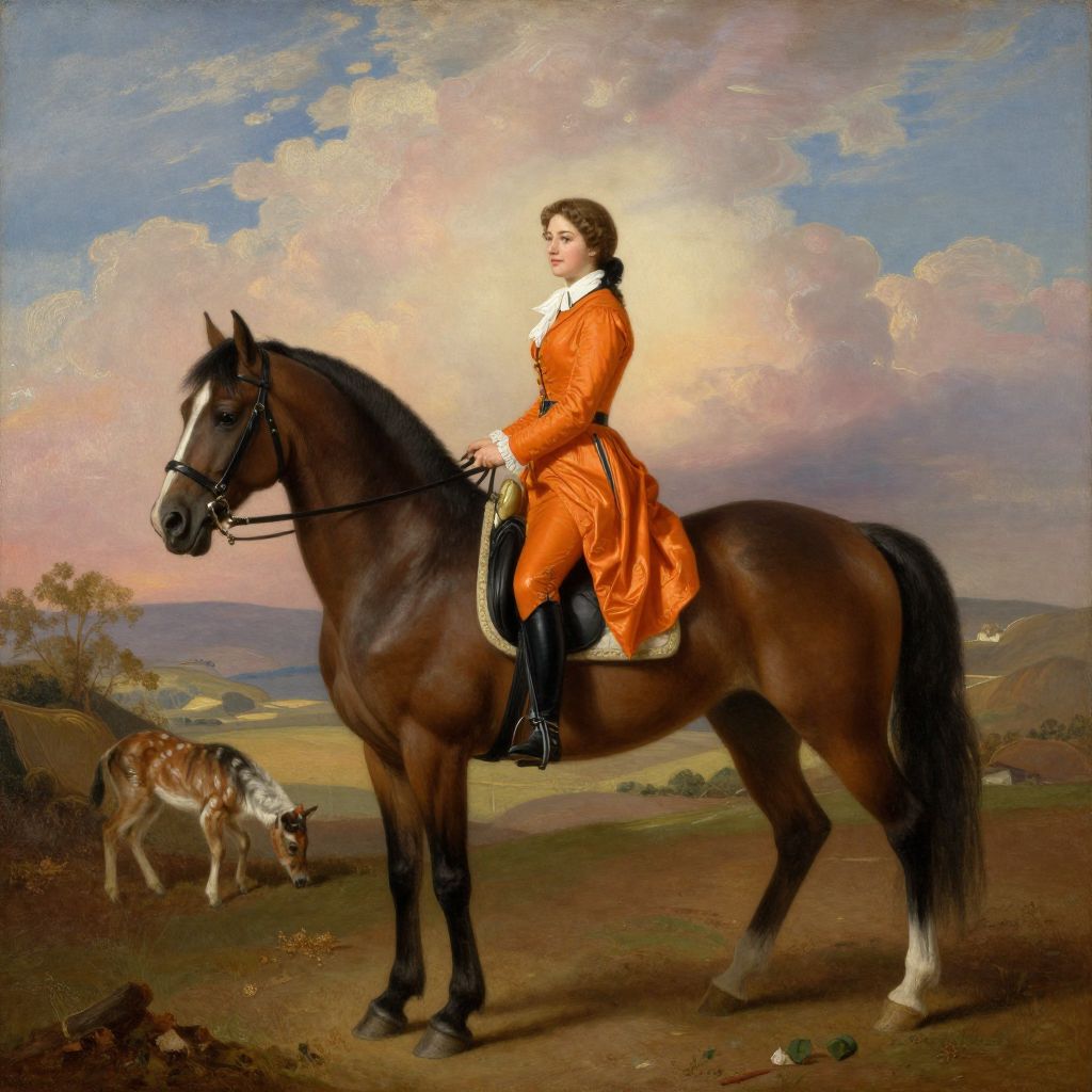 A classic oil painting reminiscent of 18th-century European portraiture, featuring a woman elegantly dressed in a vibrant orange riding habit atop a brown horse, set against a serene pastoral landscape with soft, impressionistic clouds and a grazing foal in the background, capturing the timeless charm and refinement of aristocratic equestrian fashion.