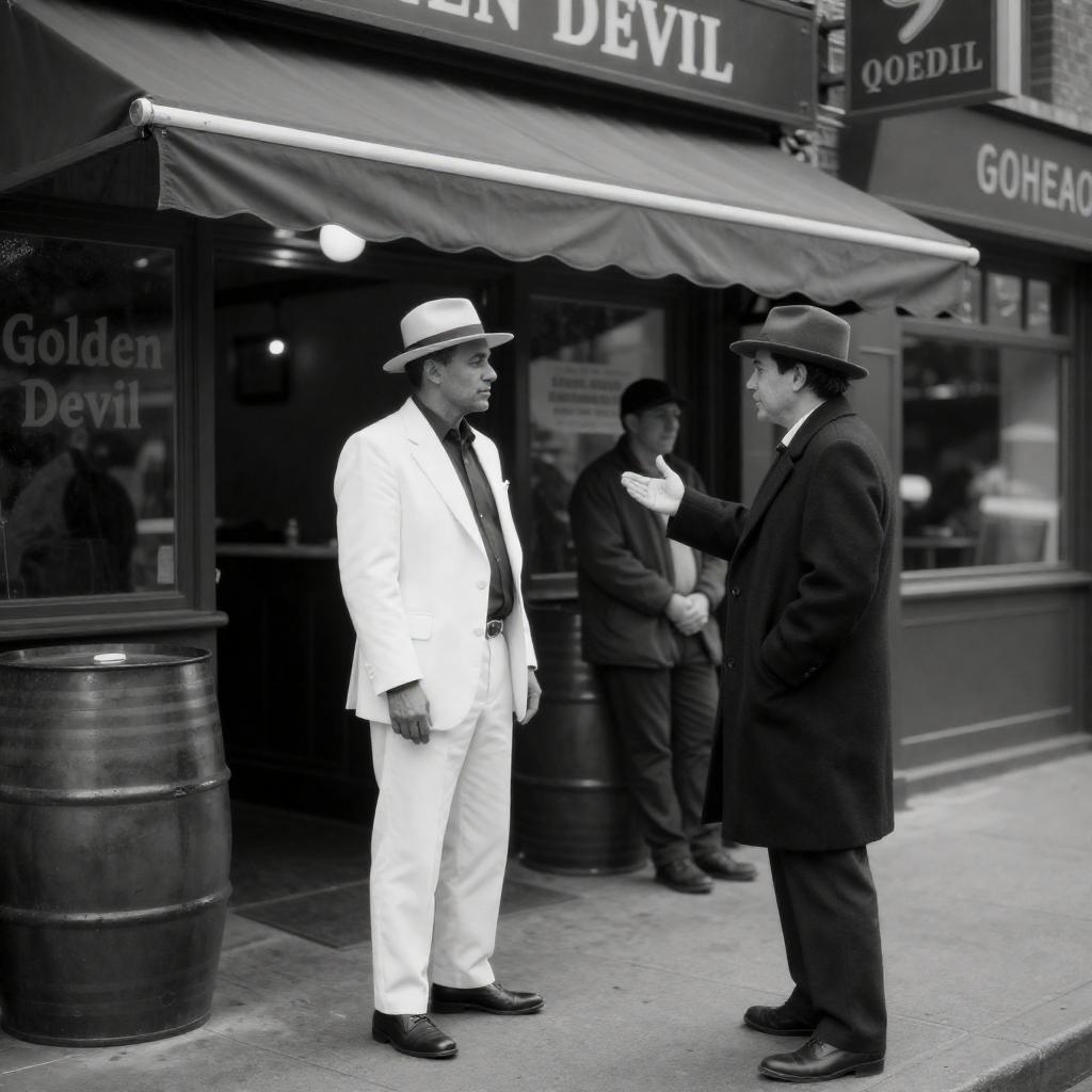 Black-and-white photograph of a street scene outside a "Golden Devil" bar. A man in a white suit and hat stands on the sidewalk, facing another man in a dark coat and hat, who is gesturing with his right hand. A third person in the background leans against a barrel. The bar's sign and awning are visible.