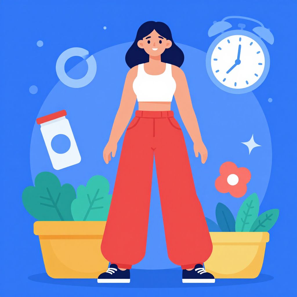 This digital illustration features a smiling woman with medium-length black hair, wearing a white sleeveless crop top and high-waisted, loose-fitting red pants. She stands against a light blue background with two potted cactus plants on either side. A white clock with black hands is positioned on the upper right, showing 10:10. The style is cartoonish with flat colors and simple shapes, emphasizing a cheerful, modern aesthetic. The woman's black shoes are visible at the bottom. The background includes subtle, circular light blue and white patterns.