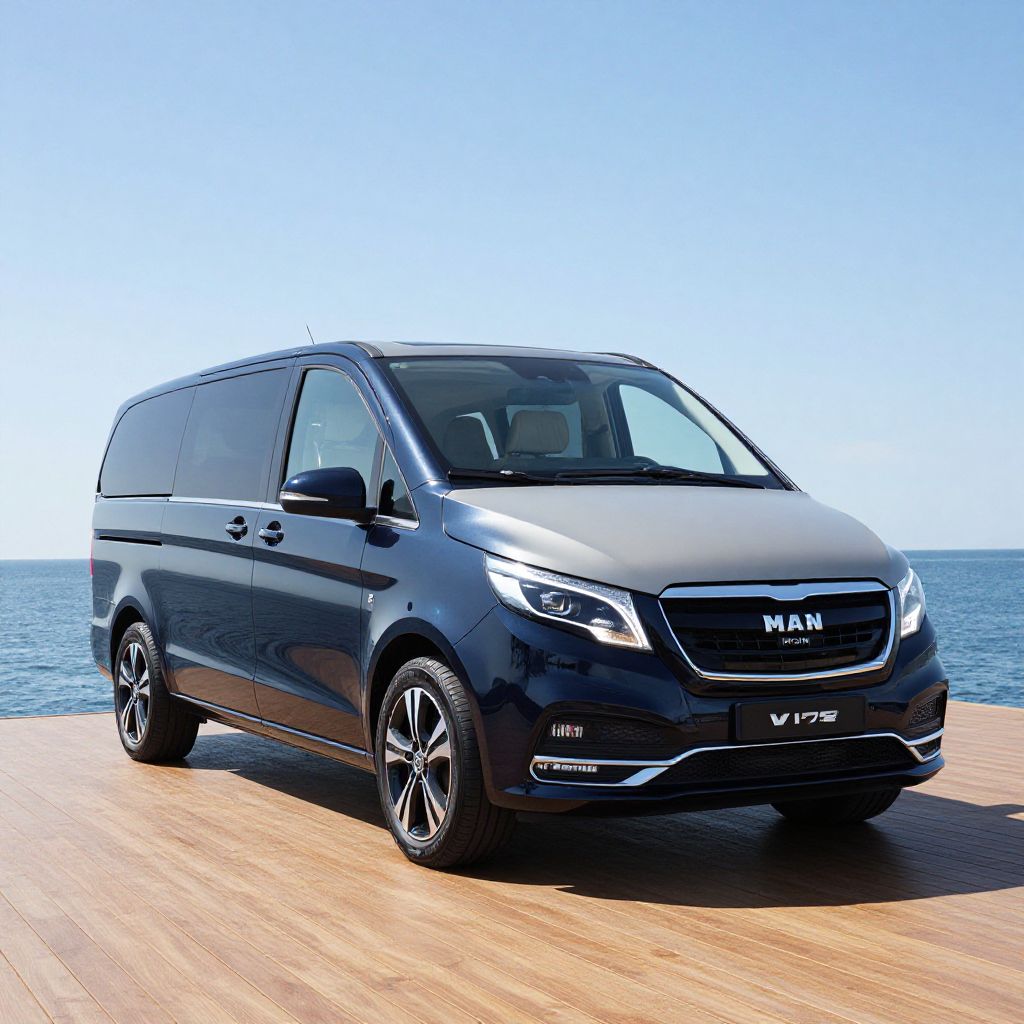 Photograph of a sleek, black Mazda Touring minivan with shiny chrome accents and black-tinted windows, parked on a wooden deck by a calm blue ocean under a clear, bright sky. The minivan has modern, angular headlights, a prominent Mazda grille with the "MAZDA" logo, and silver alloy wheels with black accents. The front license plate reads "VY3." The deck's wooden planks add a natural texture, contrasting with the smooth, reflective surface of the minivan. The background showcases the tranquil sea and clear sky, enhancing the vehicle's polished appearance. The overall scene is bright and sunlit, highlighting the minivan's modern design.