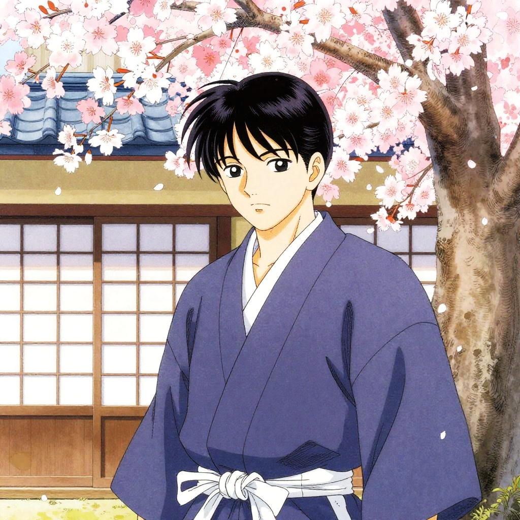 Shoji manga style illustration of a young samurai standing under cherry blossom trees, intricate linework, soft pastel colors, traditional Japanese shoji screen background, detailed facial expressions
