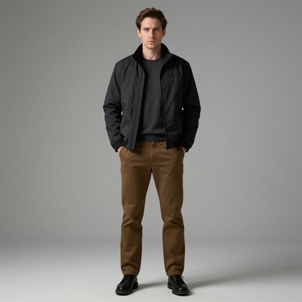 Man with brown hair, a black and grey jacket, brown pants, and black shoes. He is standing with his hands in his pockets, and has a serious expression on his face.